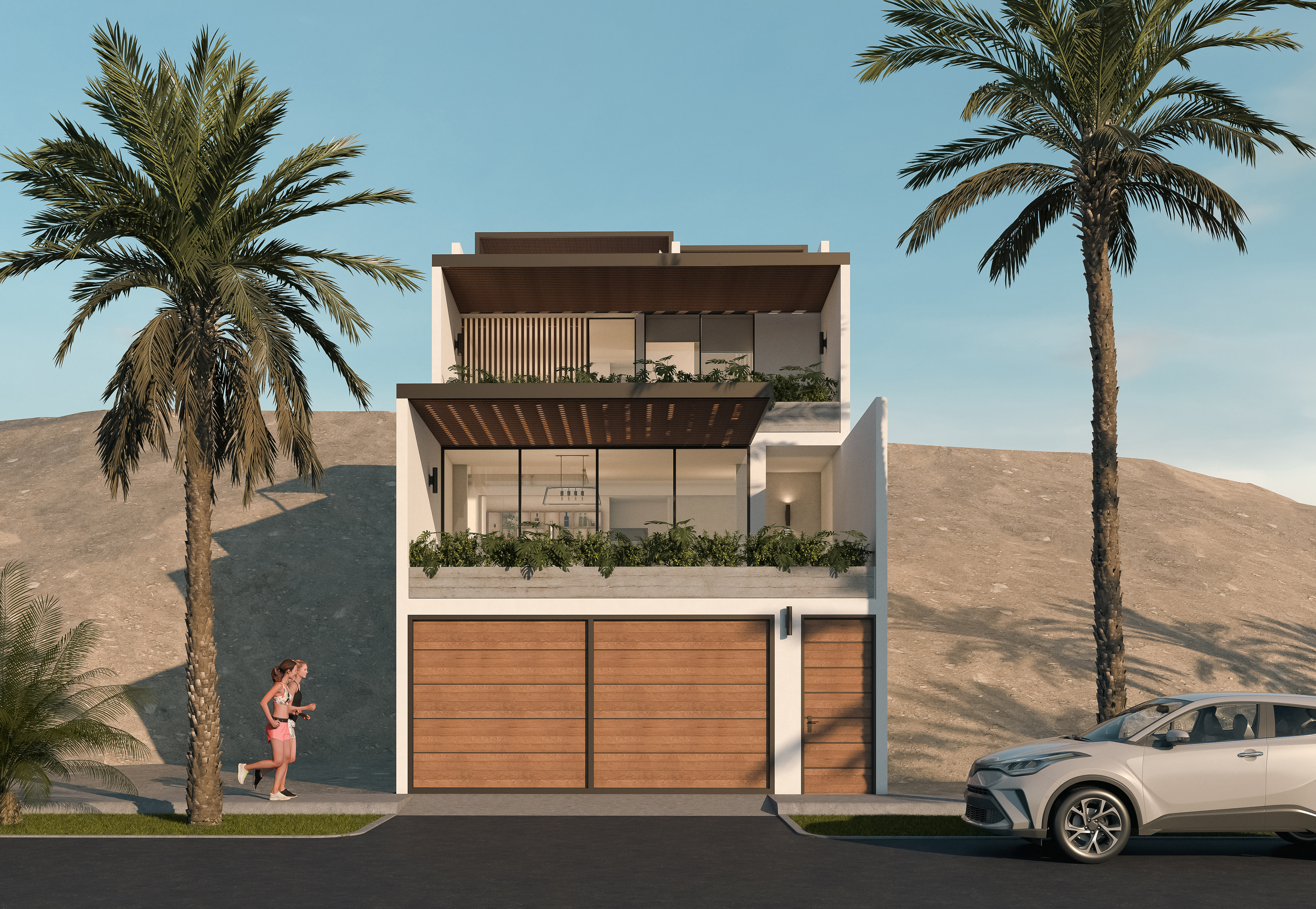 El lote se encuentra en una pendiente, sobre la cual se emplaza este proyecto con un perfil aterrazado, con retiros en todos sus pisos.